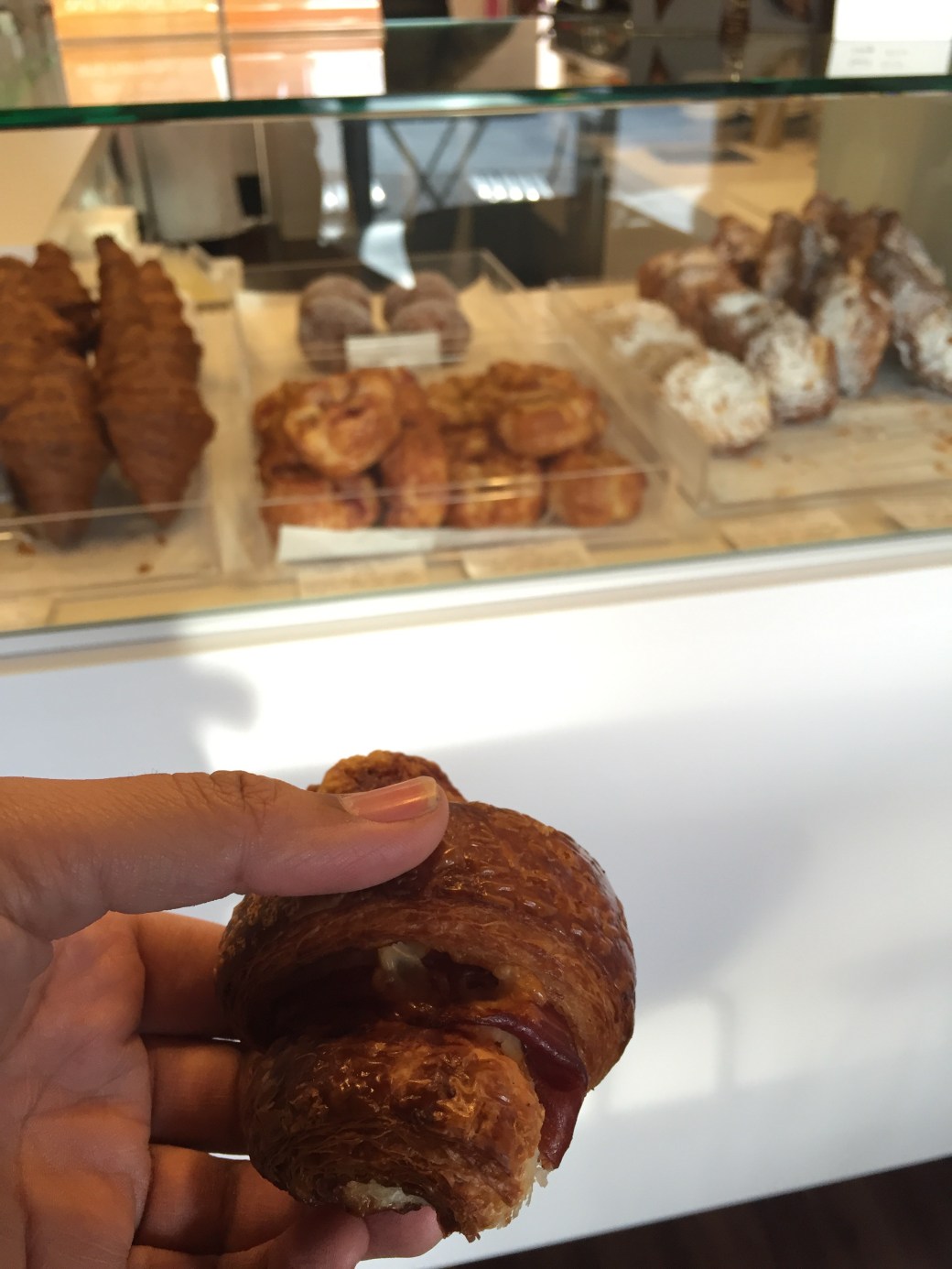 Maybe I missed the memo of the Friday-trip-to-Janjou’s because when I walked in, the line was out the door. It was so busy the chef herself had to staff the register! Waiting in line was actually enjoyable because I was greeted by this large glass display filled with these delectable desserts crafted with immaculate detail and to perfection. From the eclair covered with glazed chocolate, to the Framboise Tart, covered with fresh raspberry, to my ham & Gruyere croissant. I was imaging taking a bite of the chocolate eclair, and how it elevated my mind as a foodie Ecstasy.